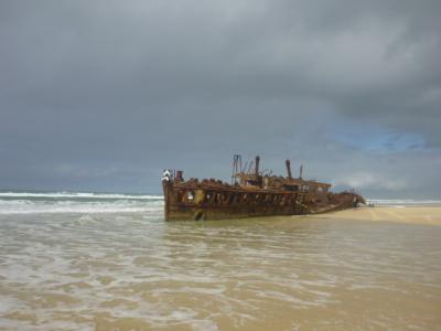 Hier gibt’s auch auf den „Strassen“ Stadtschilder, denn wir mussten in einen Ort, um unser Rückticket für die Fähre zu holen... Aber so ein Strand geht auch immer grad aus, also Fahrerwechsel und ich durfte fahren ;) natürlich war es sehr ungewohnt, denn man schaltet ja mit links und in dem Sand ist das Fahrverhältnis anders. Aber wir mussten auch sehr aufpassen, denn ohne es vorher sehen zu können, war auf einmal wie ein kleiner Fluss ins Meer und der Absatz war teilweise sehr tief. Eigentlich mit einem 4WD kein Problem, aber selbst das war zu hoch. Aber wir konnten ca.20 cm vor dem großen Absatz stoppen und fuhren aus schreck erst einmal ein Stück zurück um es zu fotografieren. Es war nicht allzu schönes Wetter und unser Scheibenwischer ist auch defekt, also fuhren wir nur zum Wrack und dann weiter auf dem Campingplatz. Wir bauten wieder ein Zelt auf, aber spannten zusätzlich noch eine Plane über das Zelt, denn es begann wieder zu regnen (und bei so einem Wetter gehen wir campen) aber das nenn ich Abenteuer… Wir grillten uns unsere Burger und setzten uns danach zu 4 sehr netten Australiern ans Lagerfeuer, die uns auch sehr gute Tipps für den nächsten Tag auf der Insel gaben. Man muss sich hier immer nach Ebbe und Flut richten, denn bei Flut kann man nicht am Strand fahren. Aber so wie die möchte ich auch einmal grillen. Kleine Eisenständer mitten ins Feuer und dann darauf Steaks und Bratwürste. Gott sei Dank haben wir kurz vorher gegessen, sonst wär uns wahrscheinlich das Wasser im Mund zusammen gelaufen:)